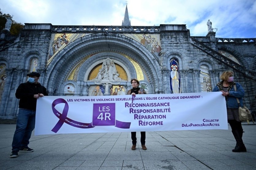 Des fidèles tiennent une banderole réclamant "reconnaissance", "responsabilité", "réparation" et "réforme" de l'Eglise à l'appel du collectif "De la parole aux actes", le 6 novembre 2021 à Lourdes Valentine CHAPUIS [AFP]