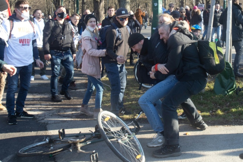 Un manifestant et un contre-manifestant se battent lors d'un défilé contre les restrictions destinées à lutter contre le Covid-19, à Vienne (Autriche), le 6 mars 2021. ALEX HALADA [AFP]