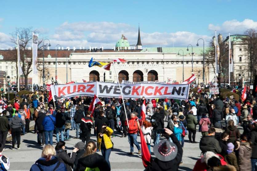 Les manifestants ont scandé des slogans et brandi des pancartes exigeant la démission du chancelier de centre droit Sebastian Kurz, ou encore hostiles aux médias, qualifiés de "presse mensongère".