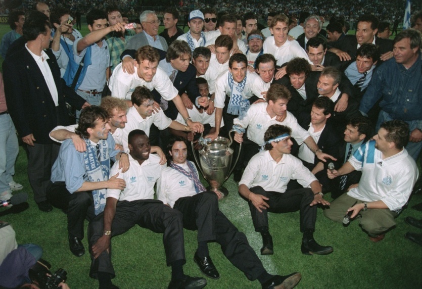 Le 27 mai 1993 au Stade Vélodrome, à Marseille, Bernard Tapie pose avec les joueurs de l'Olympique Marseille (OM) et la Coupe d'Europe des clubs champions que le club vient de remporter face au Milan AC BORIS HORVAT [AFP/Archives]