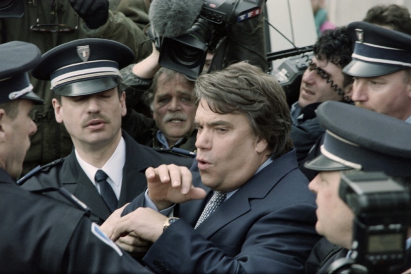 Escorté par des policiers, Bernard Tapie quitte un tribunal de Valenciennes, le 13 mars 1995 Thomas COEX [AFP/Archives]