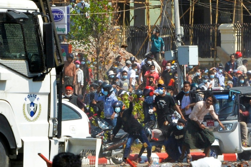 Des manifestants affrontent la police à Naypyidaw, Birmanie, le 9 février 2021 STR [AFP]