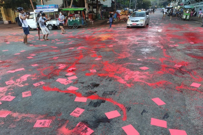 Samedi, ils ont jeté dans les rues du centre de Rangoun, près de la pagode Shwedagon, de la peinture écarlate dans le cadre d'une initiative nommée "Mouvement rouge".