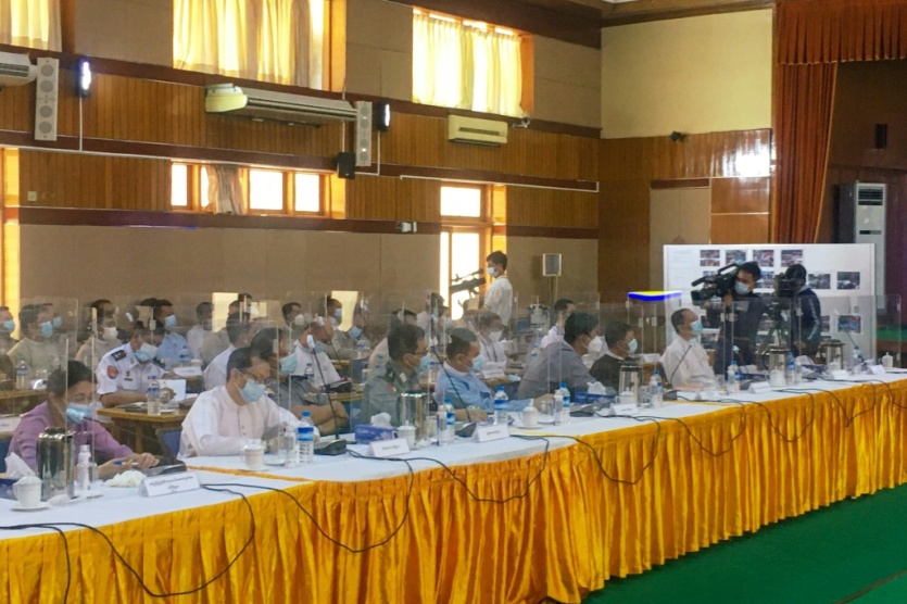 Des officiels birmans assistent à une conférence de presse organisée par le régime militaire le 9 avril 2021 à Naypyidaw STR [AFP]