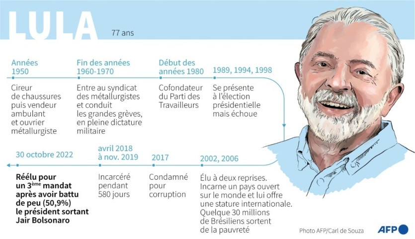 - | Crée le 30.12.2022 à 05h28 | Mis à jour le 30.12.2022 à 15h28ImprimerLe président élu brésilien Luiz Inacio Lula da Silva arrive à une conférence de presse à Brasilia, le 29 décembre 2022 EVARISTO SA [AFP]Lula débute dimanche son troisième mandat de président du Brésil, un retour au pouvoir célébré par des centaines de milliers de sympathisants de gauche attendus pour une "grande fête populaire" à Brasilia en présence de nombreux chefs d'Etat, mais sous haute surveillance policière.