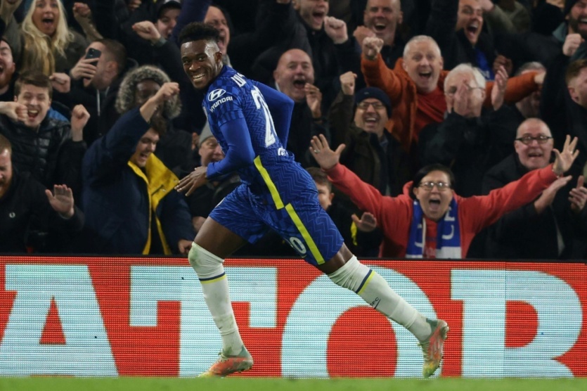 La joie du milieu de terrain de Chelsea, Callum Hudson-Odoi, après avoir marqué le 3e but à domicile contre la Juventus Turin, lors de leur match de groupes de la Ligue des Champions, le 23 novembre 2021 au Stade de Stamford Bridge à Londres Adrian DENNIS [AFP]MERCI DE VOUS IDENTIFIER