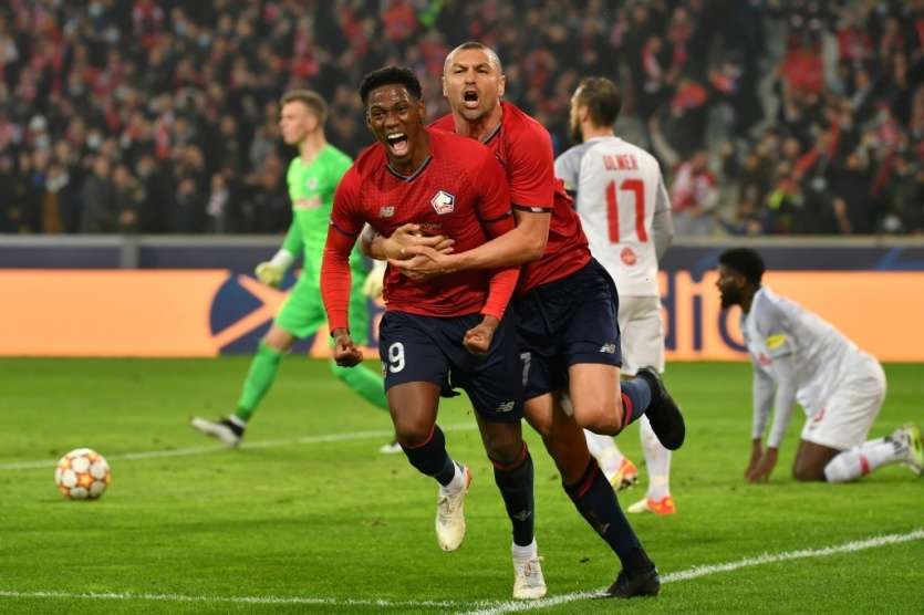 - | Crée le 24.11.2021 à 00h16 | Mis à jour le 24.11.2021 à 10h16ImprimerL'attaquant canadien de Lille, Jonathan David, est félicité par l'attaquant turc Burak Yilmaz, après avoir ouvert le score à domicile face à Salzbourg, lors de leur match de groupes de la Ligue des Champions, le 23 novembre 2021 au Stade Pierre-Mauroy Denis Charlet [AFP]Mal parti après trois journées, Lille a pris la tête de son groupe de Ligue des champions en battant Salzbourg (1-0) et peut espérer se qualifier pour les huitièmes, comme l'a fait Manchester United avec son nouvel entraîneur.