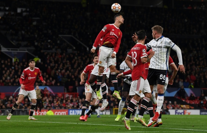 Cristiano Ronaldo l'attaquant portugais de Manchester United marque de la tête en Ligue des champions contre l'Atalanta à Old Trafford à Manchester en Angleterre le 20 octobre 2021. Paul ELLIS [AFP]MERCI DE VOUS IDENTIFIER