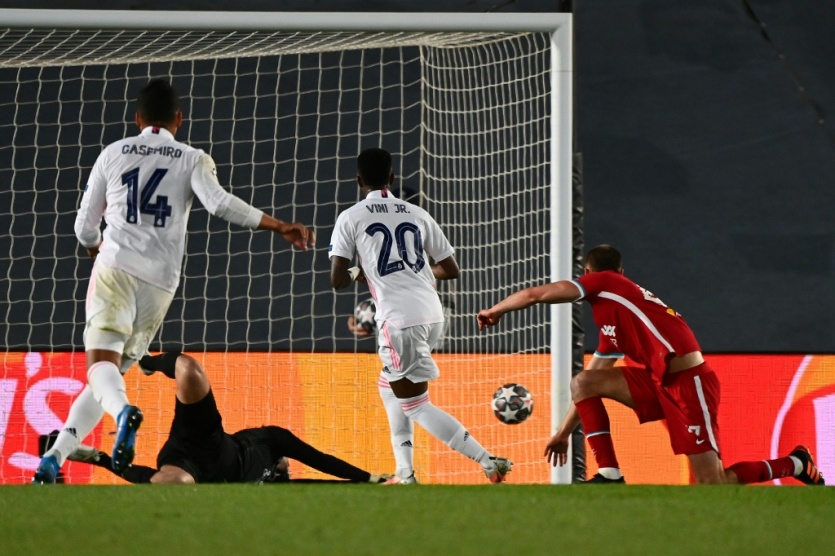 Vinicius Junior ouvre le score pour le Real face à Liverpool en quart de finale de C1 à Valdebebas en banlieue de Madrid, le 6 avril 2021 GABRIEL BOUYS [AFP]