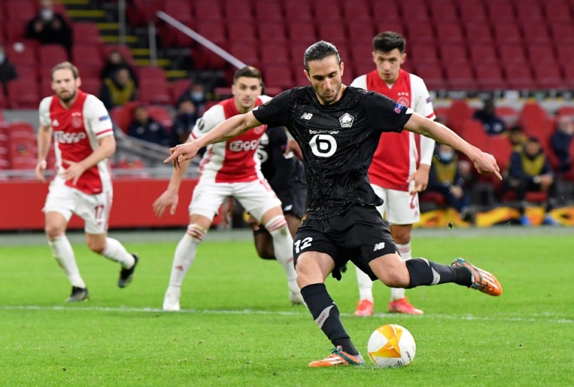 Le milieu de terrain de Lille, le Turc Yusuf Yazici, transforme un pénalty face à l'Ajax Amsterdam, lors du 16e de finale retour de la Ligue Europa, le 25 février 2021 à Amsterdam JOHN THYS [AFP]