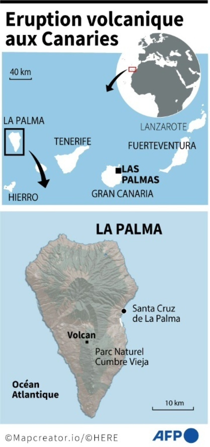 - | Crée le 20.09.2021 à 12h44 | Mis à jour le 20.09.2021 à 21h44ImprimerLe volcan Cumbre Vieja, entré en éruption sur l'île espagnole de la Palma dans l'archipel des Canaries, vu depuis Los Llanos de Aridane le 20 septembtre 2021 DESIREE MARTIN [AFP]Le volcan entré en éruption sur l'île espagnole de La Palma, dans l'archipel touristique des Canaries, continuait lundi matin de cracher sa lave qui a détruit, selon les autorités, de "nombreuses" maisons en descendant lentement vers la mer.