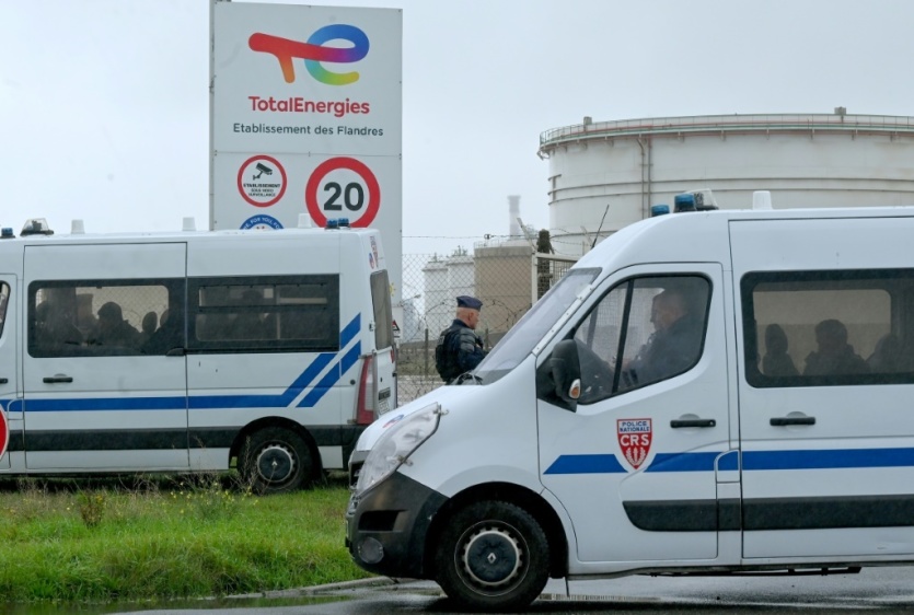 Des véhicules de CRS devant l'entrée du dépôt TotalEnergies des Flandres, le 13 octobre 2022 à Mardyck, dans le Nord DENIS CHARLET [AFP]