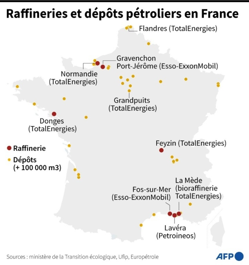 Les raffineries et principaux dépôts pétroliers en France métropolitaine Sabrina BLANCHARD [AFP]MERCI DE VOUS IDENTIFIER