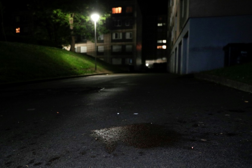 Une tâche de sang au pied d'une résidence faisant partie du "Hameau des Perroquets", à Champigny-sur-Marne, où un jeune de 17 ans a été tué le 18 mai 2021 GEOFFROY VAN DER HASSELT [AFP]MERCI DE VOUS IDENTIFIER