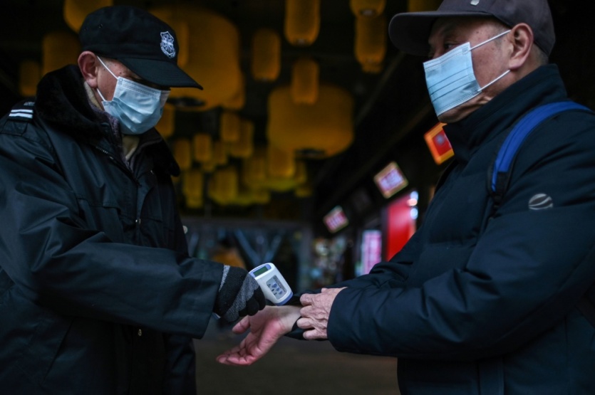 Un agent contrôle la température d'un client à l'entrée d'un centre commercial, le 22 janvier 2021 à Wuhan, en Chine Hector RETAMAL [AFP]