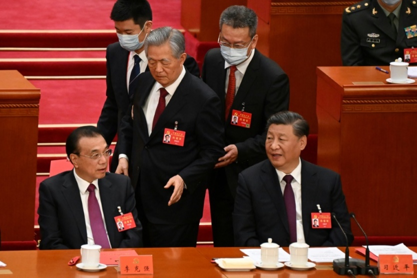 Seul incident marquant durant une cérémonie très chorégraphiée, l'ancien président Hu Jintao a été escorté vers la sortie, ont constaté des journalistes de l'AFP.