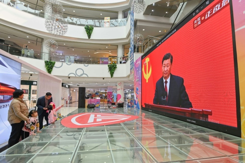 Les passants regardent une émission en direct du président chinois Xi Jinping, sur un écran dans un centre commercial de Qingzhou, dans la province orientale du Shandong, le 23 octobre 2022 STR [AFP]