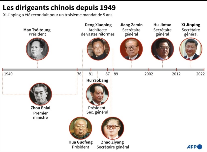 - | Crée le 23.10.2022 à 06h53 | Mis à jour le 24.10.2022 à 05h24ImprimerLe président chinois Xi Jinping, le 22 octobre 2022 à Pékin Noel CELIS [AFP]Le président chinois Xi Jinping a été reconduit dimanche à la tête du Parti communiste, s'entourant de fidèles alliés pour devenir le dirigeant le plus puissant de la Chine moderne.