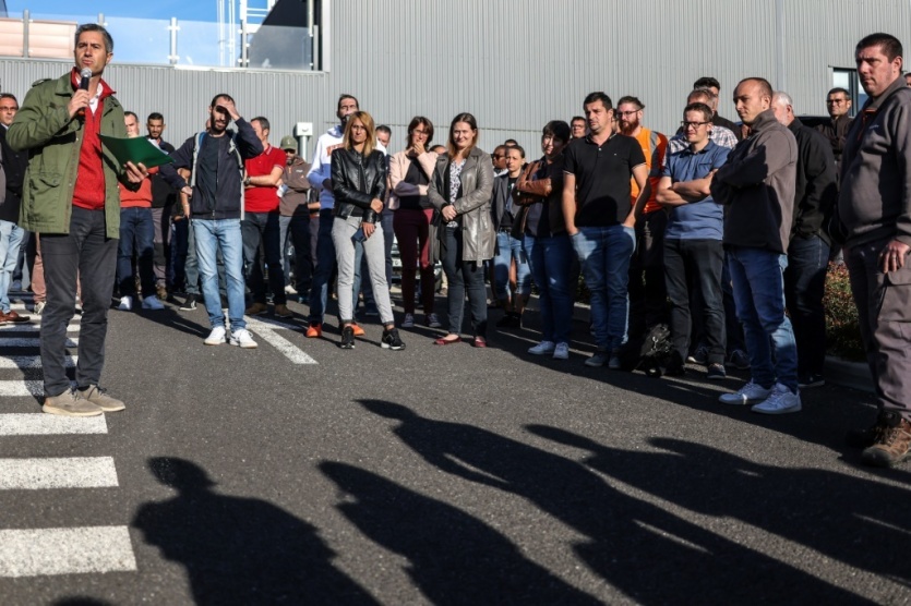 Des salariés de Scopelec sur le site de Saint-Orens-de-Gameville, lors de la venue du député LFI François Ruffin, le 19 septembre 2022 Charly TRIBALLEAU [AFP]
