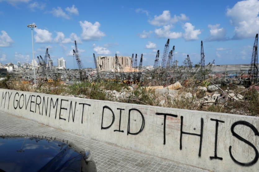 Sur un pont surplombant le port de Beyrouth, dévasté le 4 août par une explosion, des Libanais ont tagué "Mon gouvernement a fait ça", le 9 août 2020 ANWAR AMRO [AFP/Archives]