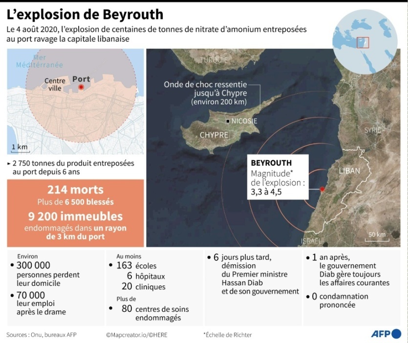 L'explosion a fait 214 morts, plus de 6.500 blessés et ravagé des quartiers entiers de Beyrouth.