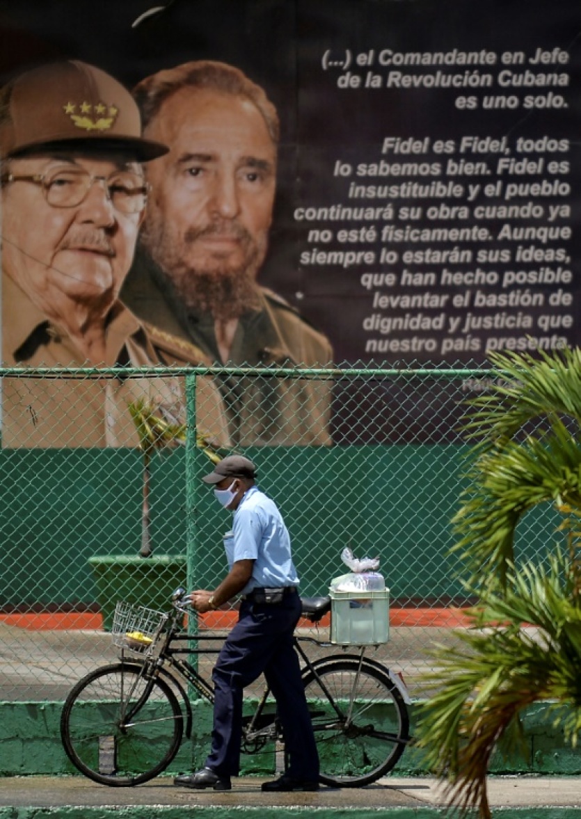 Un homme passe devant une affiche montrant les ex-présidents cubains Fidel et Raul Castro, à La Havane le 13 avril 2021 YAMIL LAGE [AFP]MERCI DE VOUS IDENTIFIER