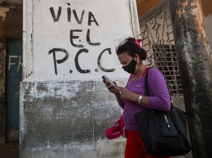 Une Cubaine passe devant un graffiti disant "Vive le PCC", le Parti communiste cubain, à La Havane le 6 avril 2021 YAMIL LAGE [AFP]