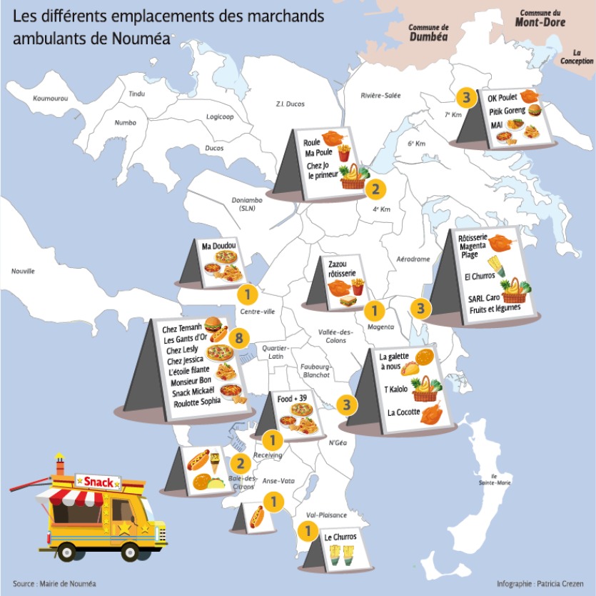 - Poulet frit, plat asiatique, street-food, churros, fruits et légumes...On les aperçoit au bord d'une route ou sur des stationnements de parking. La ville de Nouméa compte vingt-sept marchands ambulants installés sur un espace géré par la mairie moyennant un loyer mensuel et de nombreux contrôles. Certains sont installés depuis des années, d'autres ont fermé ou ont changé d'emplacement. Tour d'horizon.Une fusion italo-japonaise au Receiving avec le Plus 39 Alex Gallo et Takashi Fukuori collaborent depuis octobre. Le Plus 39 ? « C'est l'indicatif téléphonique de l'Italie, s'exclameIl vous reste 95% de l'article à découvrir.Cet article est réservé aux abonnés.