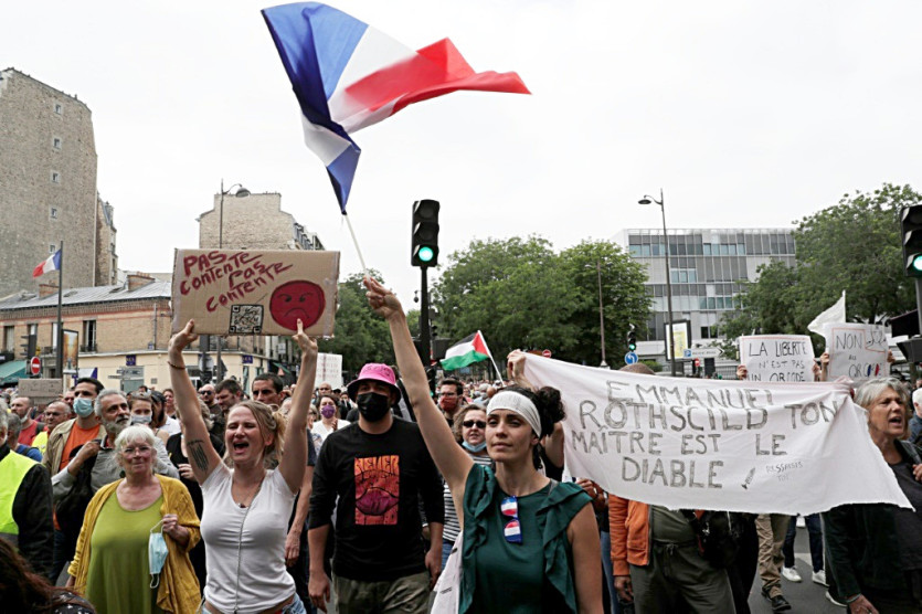 En tête du cortège, où fleurissaient les drapeaux français, figuraient l'ex-numéro 2 du Front national Florian Philippot, la députée ex-LREM covidosceptique Martine Wonner, le chanteur Francis Lalanne ou encore l'ex-égérie "gilets jaunes" Jacline Mouraud.