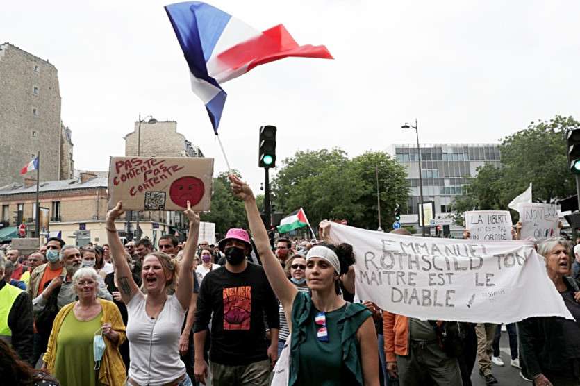 "Non au pass nazitaire", "fausse pandémie, vraie dictature" "Pays de Pasteur, pas de passepeur" ou "Je ne suis pas un QR code", pouvait-on lire sur les pancartes du cortège.