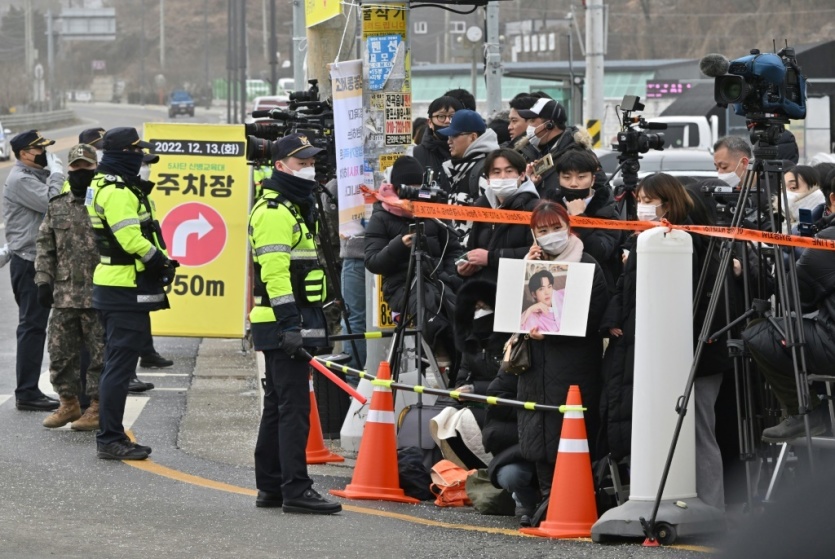 Des fans de BTS et des journalistes se massent à l'entrée de la base militaire de Yeoncheon, au nord de Séoul, pour attendre l'arrivée de Jin, l'aîné du groupe BTS qui commence son service militaire Jung Yeon-je [AFP]