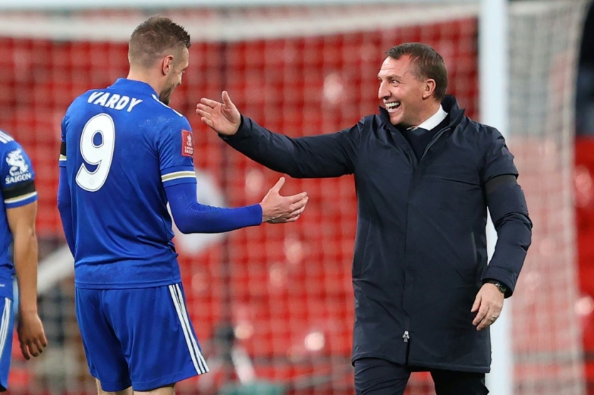 La joie de l'entraîneur de Leicester, le Nord-irlandais Brendan Rodgers, et de son attaquant Jamie Vardy, après la victoire, 1-0 face à Southampton, en demi-finale de la Coupe d'Angleterre, le 18 avril 2021 au stade de Wembley à Londres Richard Heathcote [POOL/AFP/Archives]