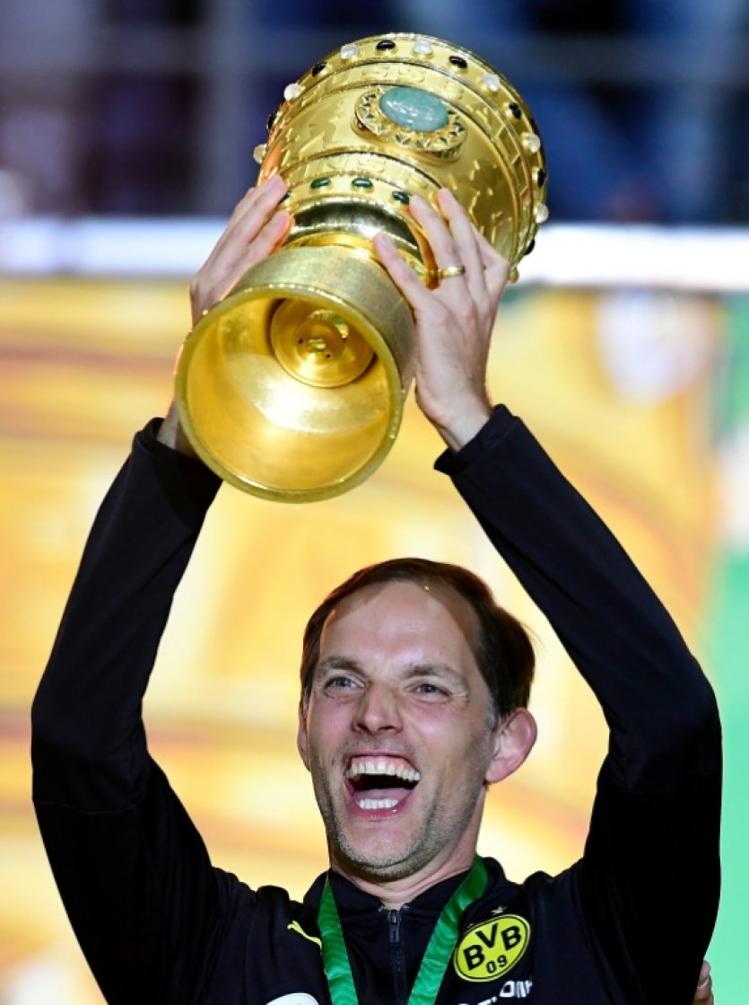 L'Allemand Thomas Tuchel, alors entraîneur à Dortmund, soulève le trophée de la Coupe d'Allemagne, après la victoire en finale face à l'Eintracht Frankfort, le 27 mai 2017 au stade Olympique à Berlin Tobias SCHWARZ [AFP/Archives]MERCI DE VOUS IDENTIFIER