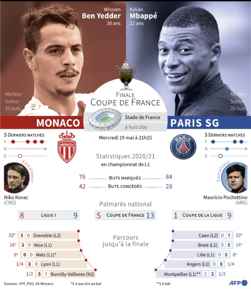 - | Crée le 19.05.2021 à 18h12 | Mis à jour le 19.05.2021 à 19h12ImprimerLes Parisiens lors de l'entraînement de veille de match au Stade de France, le 18 mai 2021, en vue de la finale de la Coupe de France contre Monaco Anne-Christine POUJOULAT [AFP]Le soir de la réouverture des terrasses, mercredi (21h15), la finale de la Coupe de France va opposer deux clubs assoiffés de gloire: le Paris SG et Monaco, qui peuvent encore réussir le doublé avec le Championnat... comme tout perdre en quatre jours.