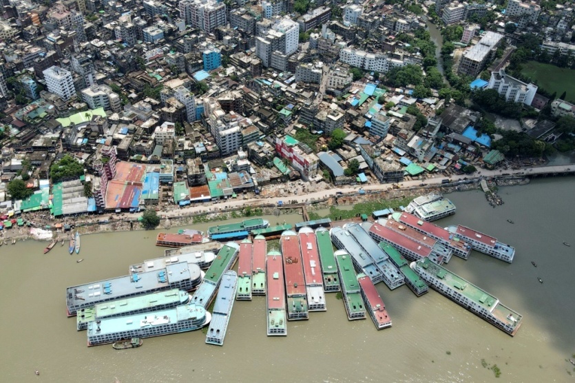 Photo aérienne prise le 5 juillet 2021, montrant des ferries de passagers stationnés pendant le confinement à Dacca, au Bangladesh Munir uz zaman [AFP]MERCI DE VOUS IDENTIFIER