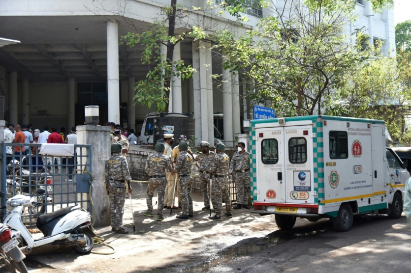 Des policiers devant un hôpital à Nashik où 22 patients sont morts en raison d'une coupure d'alimentation en oxygène de ventilateurs, le 21 avril 2021 en Inde VIRU Kadam [AFP]