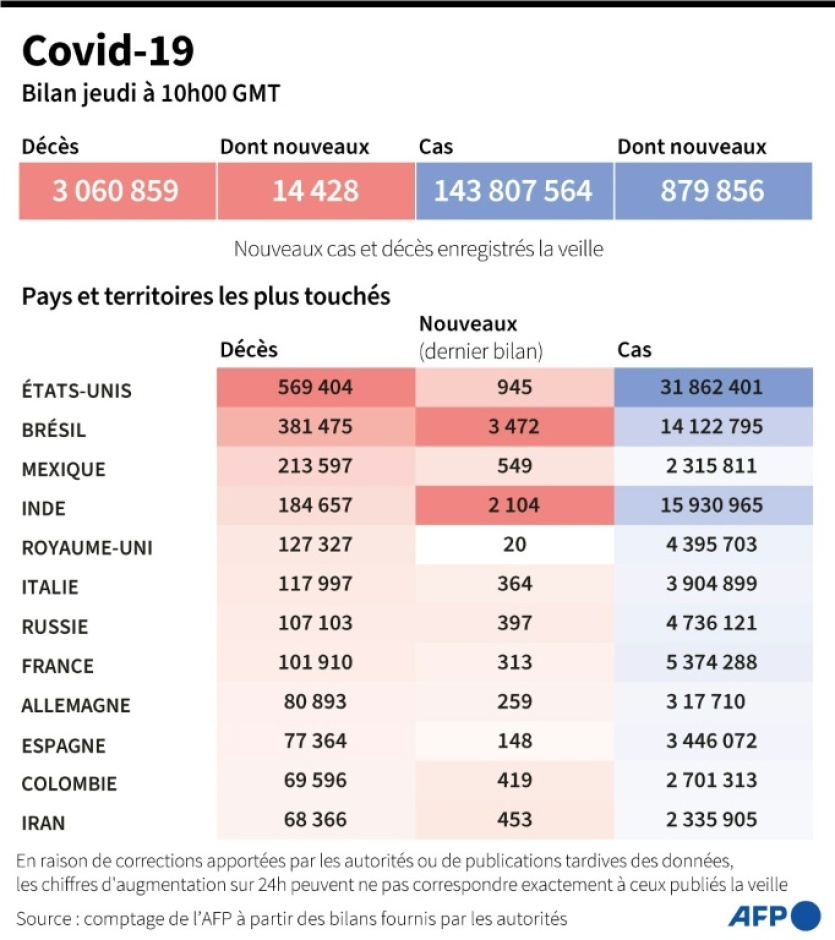 La pandémie du nouveau coronavirus a fait au moins 3.060.859 morts dans le monde depuis que le bureau de l'OMS en Chine a fait état de l'apparition de la maladie fin décembre 2019, selon un bilan établi par l'AFP à partir de sources officielles jeudi en milieu de journée.