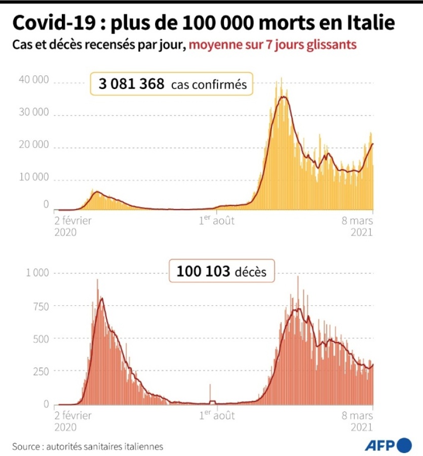 Elle a aussi prévenu que d'autres pays de l'UE pourraient bloquer les exportations de vaccins contre le Covid-19. L'Italie, qui a passé lundi la barre des 100.000 morts dus au Covid, l'a fait la semaine dernière pour une livraison du produit d'AstraZeneca vers l'Australie.