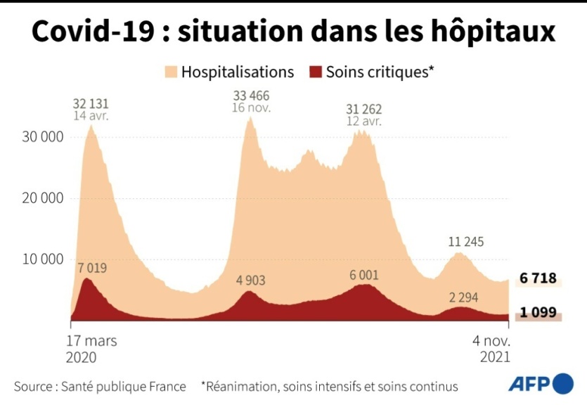 - | Crée le 05.11.2021 à 15h48 | Mis à jour le 06.11.2021 à 01h48ImprimerDes personnels soignants dans l'unité de soins intensifs Covid de l'hôpital universitaire de Montpellier, le 5 novembre 2021 Pascal GUYOT [AFP]Baisse des températures, vaccination qui plafonne, relâchement des gestes barrières : les conditions sont réunies pour favoriser une reprise épidémique qui se confirme en France, après avoir déjà gagné une bonne partie de l'Europe.