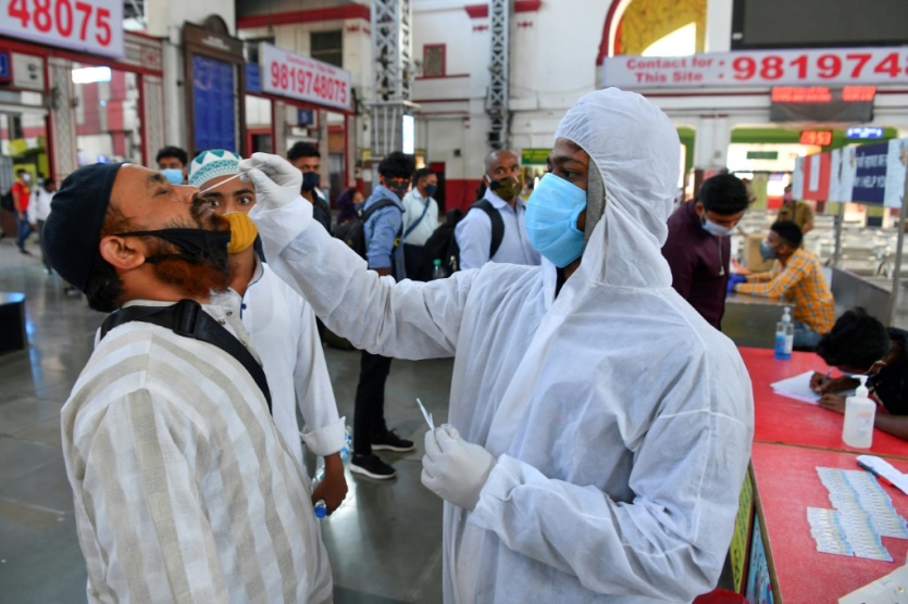 Des voyageurs subissent un test PCR à leur arrivée dans une gare de Bombay, le 22 février 2021 en Inde Indranil MUKHERJEE [AFP]MERCI DE VOUS IDENTIFIER