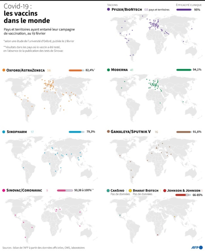 Cartes du monde montrant les pays ayant entamé leur campagne de vaccination et les différents vaccins administrés, selon un bilan de l'AFP basé sur les données officielles, au 19 février Gal ROMA [AFP]MERCI DE VOUS IDENTIFIER