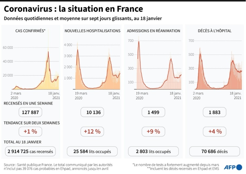 "Les nouvelles hospitalisations hebdomadaires devraient atteindre le niveau du pic de la première vague (environ 25.000 par semaine) entre mi-février et début avril, en l'absence d'interventions", ajoutent les auteurs de l'étude, qui n'évaluent toutefois pas encore les effets du couvre-feu avancé à 18H00 pour toute la France depuis samedi.
