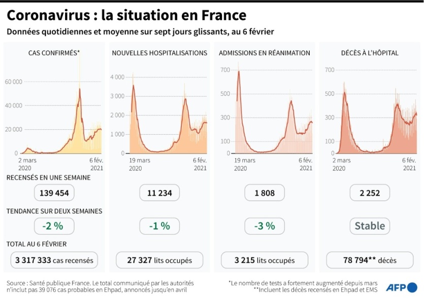 L'exécutif a toutefois fait le choix, le pari selon certains, de ne pas reconfiner le pays. Il compte sur le maintien d'un strict couvre-feu à partir de 18H00 sur l'ensemble du territoire et sur les vacances qui ont commencé samedi dans les premières académies --avec de moindres interactions sociales et la fermeture étalée des écoles jusqu'au 8 mars-- pour que la situation reste sous contrôle.