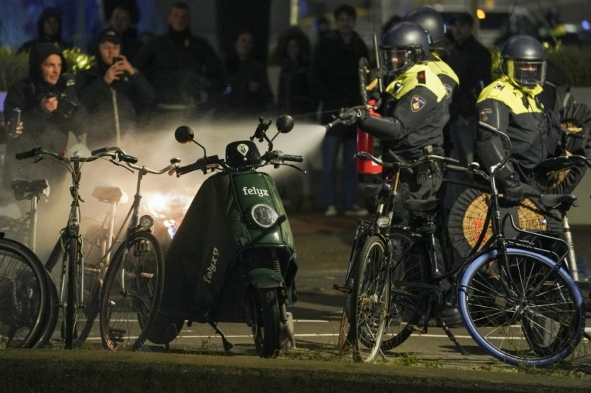 Des policiers anti-émeute éteignent un feu déclenché par des manifestants à La Haye, aux Pays-Bas, après l'annonce de nouvelles restrictions sanitaires, le 12 novembre 2021 Jeroen Jumelet [ANP/AFP]MERCI DE VOUS IDENTIFIER