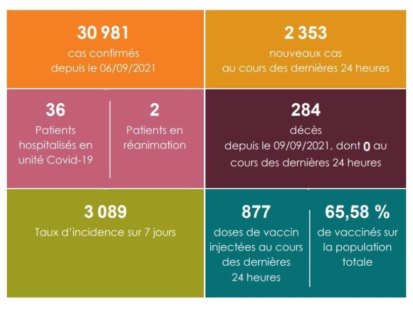- Le gouvernement vient de publier son point sanitaire quotidien.Mardi, le gouvernement a annoncé que 2 353 nouveaux tests se sont avérés positifs dans les dernières 24 heures. Le nombre de cas actifs est ainsi estimé à 11 852 dans le pays. Le taux d'incidence cumulé sur 7 jours glissants continue lui aussi de grimper et dépasse même la barre des 3Il vous reste 51% de l'article à découvrir.Cet article est réservé aux abonnés.