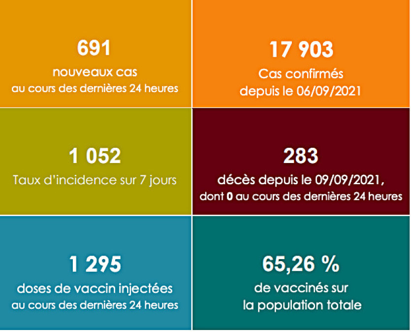 Les cas positifs comptabilisés s’élèvent à 17 903 depuis le lundi 6 septembre. Le nombre de cas actifs est de 4 193. 13 426 personnes sont considérées comme guéries par les services hospitaliers qui les ont accueillies.