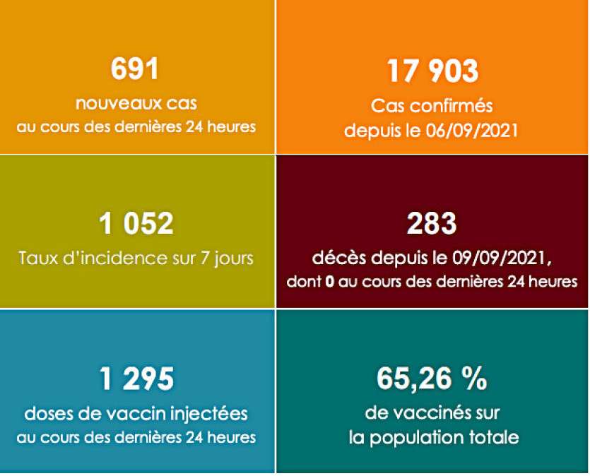 Hier, mercredi 26 janvier, 1 295 personnes ont reçu une injection de vaccin contre la Covid-19. Depuis le début de la campagne de vaccination : 185 853 personnes ont reçu au moins une dose, soit 80,32 % de la population vaccinable et 68,58 % de la population totale ; 176 864 personnes ont reçu deux doses de vaccin.