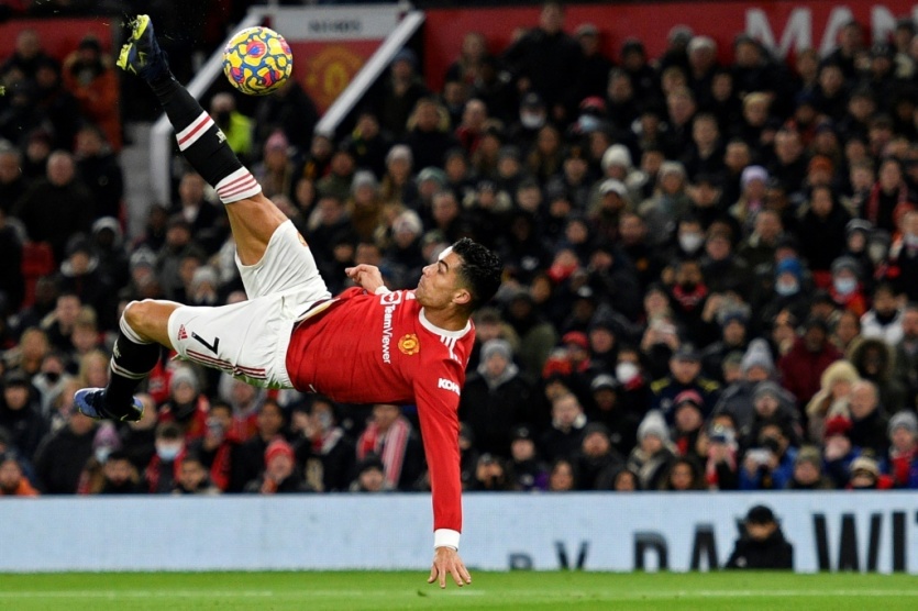 Le Mancunéen Cristiano Ronaldo tente un "retourné" lors du match entre Manchester United et Arsenal à Old Trafford à Manchester en Angleterre, le 2 décembre 2021 Oli SCARFF [AFP]MERCI DE VOUS IDENTIFIER