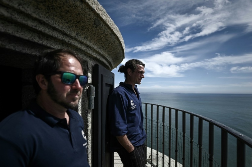 Les gardiens Thomas Dalisson (d) et Nicolas Quezel-Guerraz en haut du phare du Cordouan, le 10 juin 2021 à Verdon-sur-Mer Philippe LOPEZ [AFP]MERCI DE VOUS IDENTIFIER