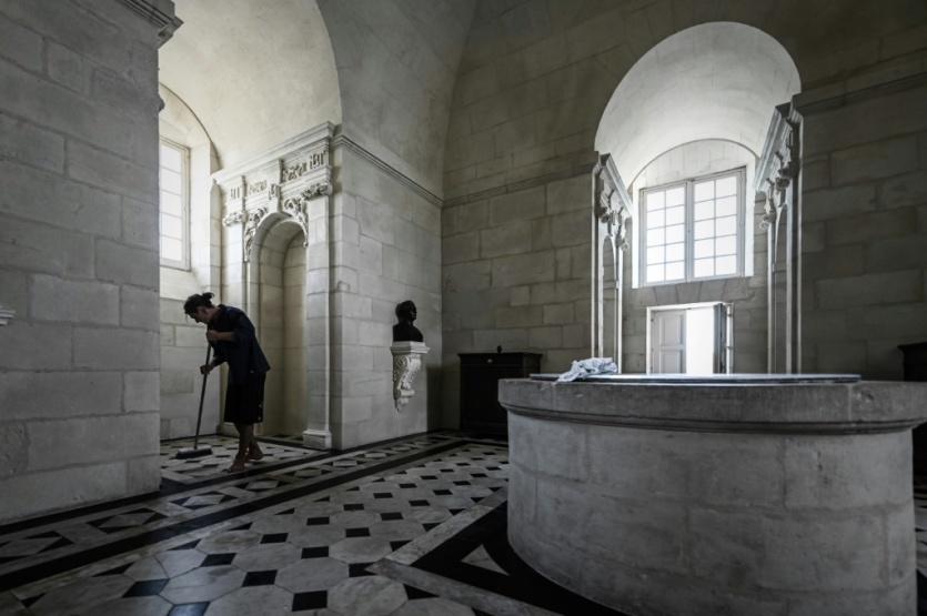 Le gardien Thomas Dalisson balaie le sol de la chapelle du phare du Cordouan, le 10 juin 2021 au Verdon-sur-Mer, en Gironde Philippe LOPEZ [AFP]
